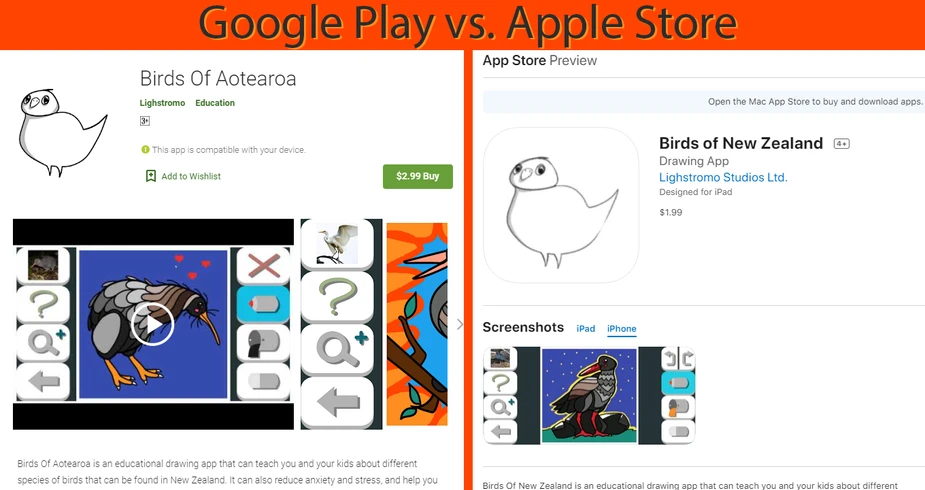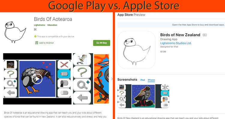 Android: https://play.google.com/store/apps/details?id=com.Lighstromo.DrawingApp https://play.google.com/store/apps/details?id=com.Lighstromo.BirdsOfZealandia